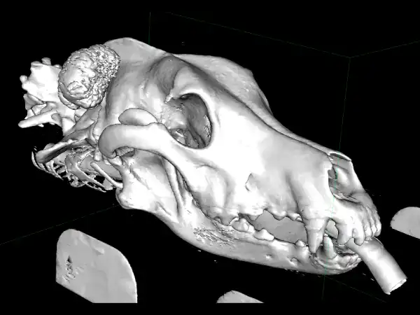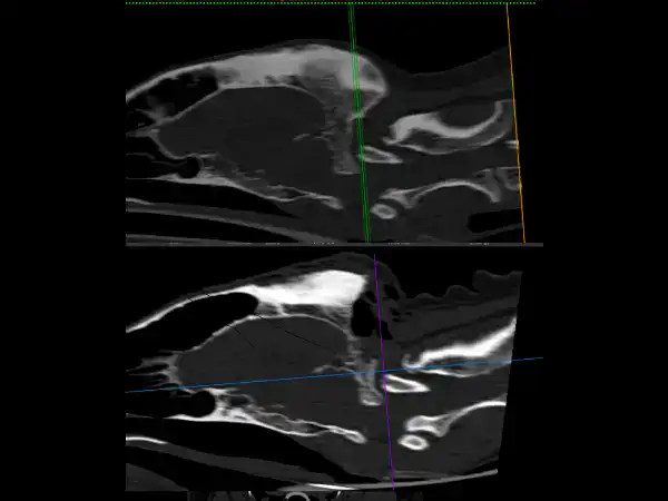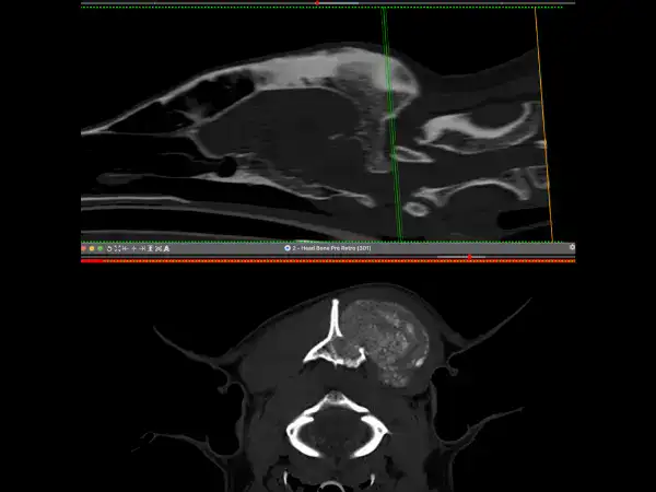CT confirmed an osteoproliferative mass originating from the nuchal crest, the appearance of which was typical for multilobular tumour of bone, also known as a multilobular osteochondrosarcoma (MLO). The histopathological diagnosis of MLO was confirmed with a minimally invasive biopsy.