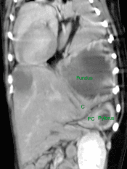 “These defects are often overlying the stomach, which can then enter the thorax and fill with air compressing the surrounding lungs and stopping the dog being able to breathe effectively.