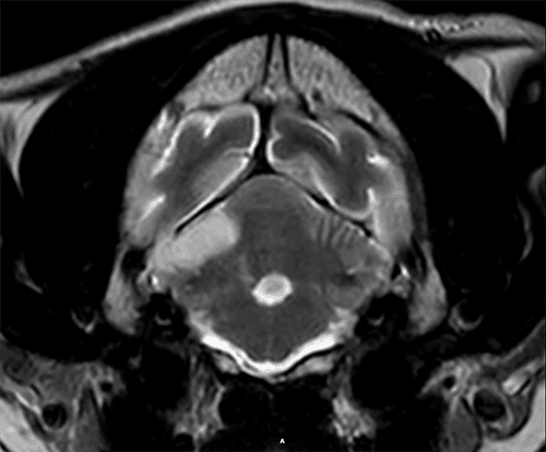 Kenji, a 14-year-old male Japanese Shiba Inu, presented to the neurology department at Eastcott following a hyperacute onset of inability to walk, severe left head tilt and left side rolling. He was neurolocalised in the central vestibular system and MRI documented changes consistent with an ischemic stroke affecting the right cerebellar hemisphere and interpositus nucleus. Kenji was hospitalized for supportive treatment during 5 days. A complete screening was realized to found the cause of the stroke, but all the results became unremarkable, showing that Kenji was healthy otherwise. He recovers completely after 2 weeks, and he is able to enjoy his life again.