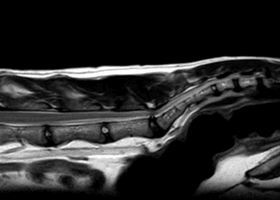 Mowgli, an 8-year-old male Main coon, was visited in our Neurology service for a chronic history of weakness affecting the hind limbs within the last 6 months, with an acute deterioration in the last week showing sporadic yelps when trying to jump. The neurological examination showed marked atrophy on hamstring muscles and severe discomfort on lumbosacral palpation. The MRI of the lumbosacral area documented a L7-S1 disc protrusion and dorsal indentation from the S1 dorsal lamina. Initially Mowgli was treated with steroid injections, but after an incomplete response to it, an L7-S1 dorsal laminectomy with discectomy were performed. After 2 months, Mowgli was free of pain and is increasing his strength on the hind limbs.